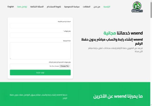 وصف الموقع: "wsend إنشاء رابط واتساب مباشر بدون حفظ الرقم لم يعد من الضروري حفظ الأرقام لإنشاء محادثات، انشىء رابط مباشر الآن مجانا"
